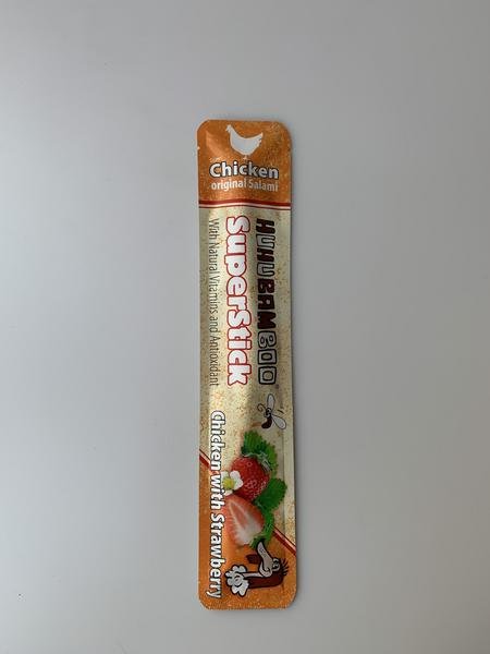 Doplňkové krmivo pro psy.Salám z kuřete a jahody - přírodní masová pochoutka pro psy.Krmny? návod: Podávejte jako odměnu při tréninku. Zajistěte dostatek čerstvé vody.Složení: Kuřecí maso 64%, jahoda 10%, rostlinný protein 10%, pšeničná mouka 6%, rostlinný glycerin 6%, sorbitol 4%, sůl 0,1%.Analytické složky: protein 30%, vlhkost 25%, obsah tuků 6%, hruby? popel 4%, vláknina 3%.Uchovávejte na suchém a chladném místě. Po otevření obal opět uzavřete a uložte do chladničky. Pamlsek není určen pro konzumaci člověkem.