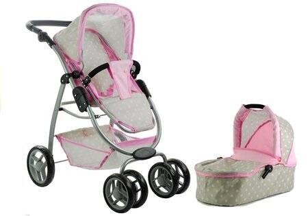 Wielofunkcyjny wózek dla lalek Alice - beżowy w pastelowe groszki Spora część kilkuletnich dziewczynek szaleje za wózeczkami, które umożliwiają im zabawę w naśladowanie swoich czułych i troskliwych mam. Chcą być takie jak one, dlatego opieka nad zabawkowym bobasem przynosi im ogromną radość. Jak urozmaicić im taką zabawę? Wybierając wózek Alice 2 w 1, który może być zarówno wózkiem spacerowym, jak i klasycznym modelem z głęboką gondolą. Jeden wózek - ogrom możliwości. W zestawie znajduje się: - konstrukcja wózka Alice, - wkład do wózka - spacerowy, - wkład do wózka - gondola, - torba, - instrukcja ułatwiająca złożenie. Prezentowany model swym wyglądem przypomina pełnowymiarowe, prawdziwe wózki. Rozwiązanie to sprawia, że każda dziewczynka opiekująca się swym zabawkowym bobasem poczuje większą odpowiedzialność i empatię, co będzie ciekawym rozwiązaniem ułatwiającym przyzwyczajenie kilkulatki do oczekiwanego, młodszego rodzeństwa. Co więcej: zabawa w dom sprawi, że dziewczynka rozwinie swe zdolności interpersonalne, a także wyobraźnię i kreatywność, tworząc nowe scenariusze zabawy. Beżowy wózeczek przełamany delikatnymi, pastelowymi detalami może być zarówno sportowym, spacerowym wózkiem, jak i klasycznym modelem z gondolą. Zmiana wariantu dziecięcego wózka w dużym stopniu urozmaica zabawę, dając dziewczynkom wiele sposobów na przyjemną zabawę. Zamiana wariantów polega na przełożeniu głównego elementu wózka, co sprawia, że wózek wygląda jak zupełnie inna zabawka. Wytrzymała i solidna konstrukcja została wykonana z aluminiowych rurek o srebrnym odcieniu, co fantastycznie komponuje się z poszyciem wózka z najwyższej jakości materiału. Beżowo-różowe pokrycie wózeczka odznacza się właściwościami gwarantującymi trwałość i długą żywotność - w razie potrzeby odpinane elementy można prać ręcznie lub czyścić wilgotną ściereczką, w celu utrzymania wysokiej higieny przedmiotu. W konstrukcji dziecięcego kremowego wózka Alice uwzględniono podwójne, obrotowe o 180 stopni koła, umieszczone w przedniej części zabawki. Odpowiadają one za zwrotność wózka, a także łatwość w prowadzeniu go i omijaniu przeszkód. Koła wózka dla lalek zostały wykonane ze specjalnego tworzywa, które gwarantuje cichą zabawę zarówno wewnątrz domu, jak i na podwórku. Kolejnym atutem prezentowanego wózka 2 w 1 jest materiałowy, zamontowany w dolnej części konstrukcji koszyk na zakupy lub drobiazgi, a także rączka do prowadzenia, posiadająca funkcję zmiany jej wysokości oraz blokadę chroniącą przed samoczynnym złożeniem wózka. Każdy z wariantów modelu Alice 2 w 1 - spacerowy i gondola, posiadają w pełni regulowany daszek, chroniący lalkę przed słońcem. Wózek dla lalek w kontrastujących kolorach sprawi wielką frajdę każdej dziewczynce, która ukończyła 3. rok życia. Dziecięcy wózek Alice został oznaczony certyfikatem CE, co stanowi potwierdzenie spełnienia wszelkich wymagań dyrektyw Unii Europejskiej. Przedstawiony model w groszki został wykonany z wysokogatunkowych, a przede wszystkim atestowanych materiałów, co gwarantuje wysoką jakość i długą żywotność zabawki. Wózek 2 w 1 do przewożenia lalek zapakowany jest w oryginalne, kartonowe pudełko, a jego złożenie trwa około 10 minut. Wymiary wózka Alice: - wózek: wys. 83 cm x szer. 45 cm x dł. 70 cm, - wysokość rączki: 42 cm - 82 cm, - koło małe: 14 cm x 3 cm, - koło duże: 16,5 cm x 3 cm, - rozstaw kół małych: 23 cm, - rozstaw kół dużych: 38 cm, - torba: 21,5 cm x 20 cm x 9 cm. Wymiary opakowania: - 38,5 cm x 59 cm x 17,5 cm.