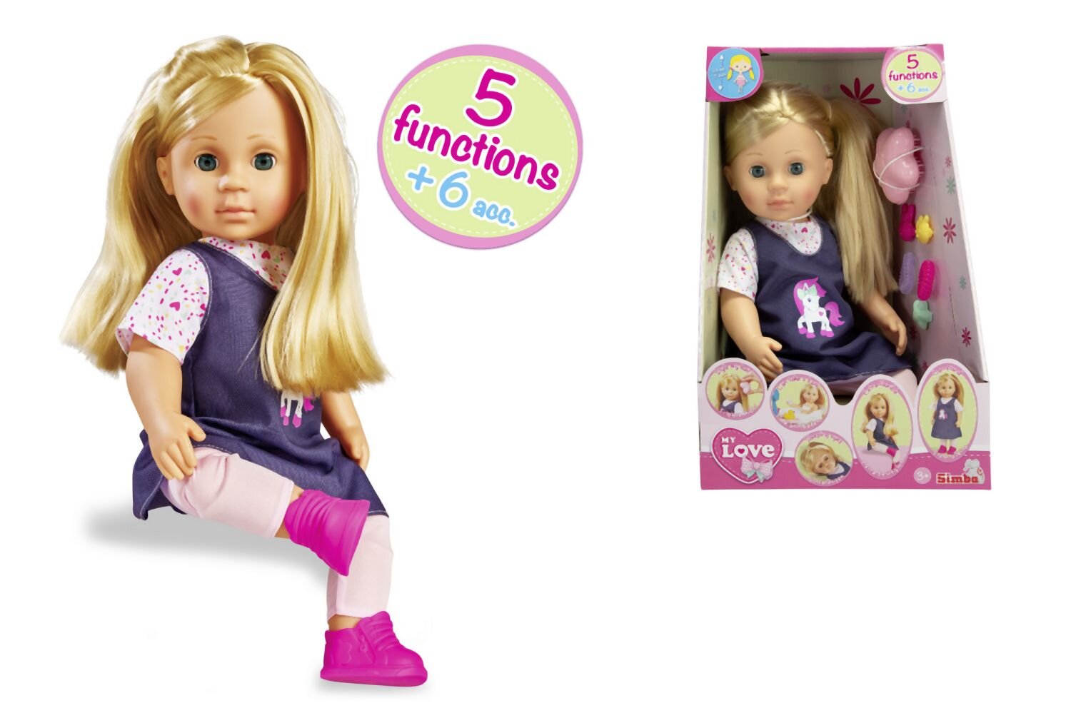 Vinylová panenka My Sister má celkem 5 funkcí - zavírá očíčka, může se koupat ve vaně, umí stát, má extra ohebná kolínka a dlouhé vlasy pro styling. Výška panenky je 43 cm. Součástí jsou doplňky do vlasů 6 ks včetně hřebenu.