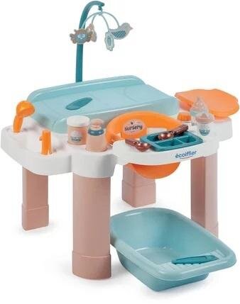 Kącik małej opiekunki z 13 akcesoriami do pielęgnacji lalki w tym wanienka, przewijak oraz karuzelka (brak lalki w zestawie). Wyprodukowane we Francji.