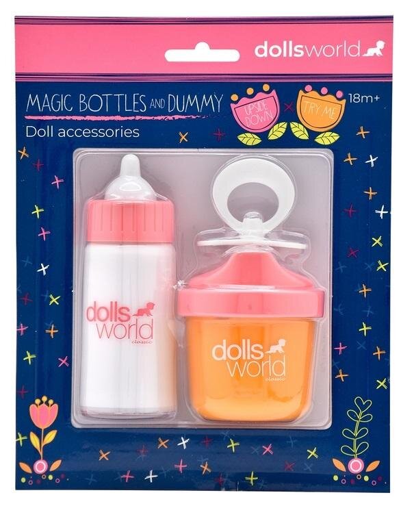 Zestaw magicznych butelek z mlekiem oraz sokiem pomarańczowym. Blister zawiera również smoczek.