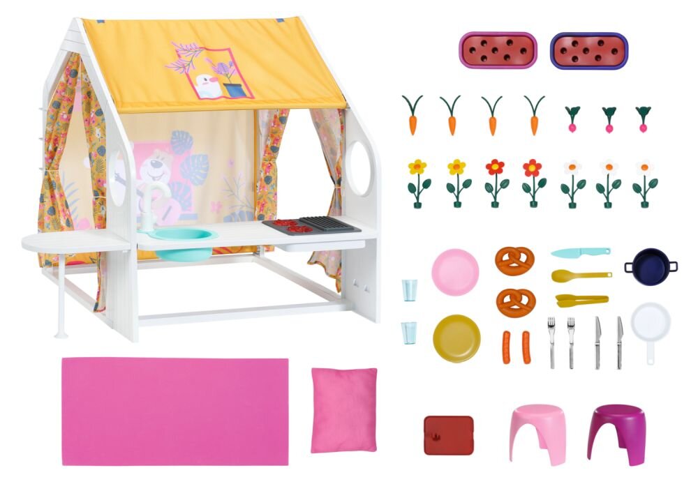 Už jste někdy slyšeli o glampingu? Tak se říká kempování s luxusním vybavením. A přesně to o víkendech ráda dělá BABY born se svými kamarády. Když k víkendovému domku dorazí, tak nejdříve otevřou žluté boční stěny, aby bylo na vše dost místa. Pak se postarají o květiny v truhlících a sklidí zeleninu k večeři. Zatímco se na sporáku připravuje jídlo, BABY born prostírá stůl. Podává se salát z mrkve a ředkviček a nechybí ani párky a preclíky. Po jídle je samozřejmě třeba umýt nádobí. Jejda, to už je ale pozdě. Dřív, než půjdeme do postýlky, tak si ještě užijeme pozorování západu slunce. Na noc si BABY born ustlala ve spacím koutku na růžovém polštářku a matraci. • Kvalitní příslušenství pro originální panenku BABY born. • Pro radost z nápadité, rozmanité a dlouhotrvající hry. • Vhodné pro panenku velikosti 36 cm a 43 cm. BABY born Víkendový domek s bohatým příslušenstvím a světelnými a zvukovými efekty.