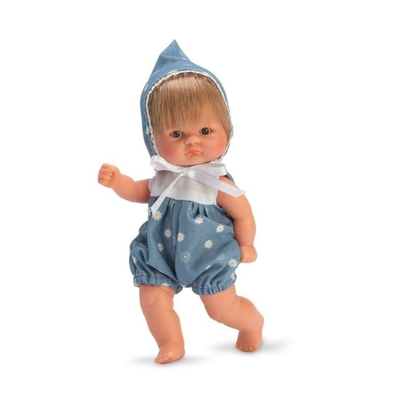 Hiszpańska lalka Bomboncin 20 cm Asi 0118081 Chcesz kupić dziecku piękną i oryginalnie prezentującą się lalę, idealną do przebierania, kąpania i zabaw w odgrywanie roli troskliwej mamusi? Model Asi 0118081 to śliczna dziewczynka z krótkimi blond włosami, zaprojektowana dla dzieci w wieku od 3 lat. Uzupełnia kolekcję niewielkich, hiszpańskich lalek Bomboncin o wysokości 20 cm. Zachwyca dopracowanym wyglądem i oryginalnym, szytym ręcznie strojem. Wysokiej jakości winyl przypomina w dotyku delikatną skórę bobasa. Naturalny wyraz twarzy, zaciśnięte piąstki, zaznaczone linie papilarne oraz malutkie paznokcie sprawiają, że zabawka wygląda niemal jak prawdziwe dziecko. Co wyróżnia lalkę hiszpańską Asi Bomboncin 0118081? Ciekawi Cię, dlaczego dziewczynki chętnie bawią się hiszpańskimi lalkami z serii Asi Bomboncin? Poznaj szczegóły wyglądu modelu 0118081: krótkie blond włosy są okryte wiązaną satynową wstążką czapeczką z ozdobnym wykończeniem, biało-pudrowa sukienka w rumianki dopełnia całość outfitu, czoło przykrywa prosta grzywka, niebieskie oczka, zaróżowione policzki, lekko otwarte usta oraz niewielkie paznokcie wyglądają jak prawdziwe, zgrabny nosek i piegi dodają lali uroku, brak zaznaczonej płci. Ruchoma głowa i kończyny pozwalają na ułożenie lali w wielu pozycjach. Modele z kolekcji Asi Bomboncin samodzielnie siedzą. Hiszpańska lalka Asi Bomboncin 0118081 wymarzonym prezentem dla dziewczynki Chcesz dziewczynce zrobić wyjątkową niespodziankę? Wysokiej jakości lalka hiszpańska Asi Bomboncin 0118081 zapakowana jest w ozdobne pudełeczko z wieczkiem. Z pewnością ucieszy każdą małą kolekcjonerkę niepowtarzalnych bobasów. Polecamy również dodatkowe komplety ubranek, uszyte specjalnie dla lalek o wysokości 20 cm, które dodatkowo uatrakcyjniają zabawę.