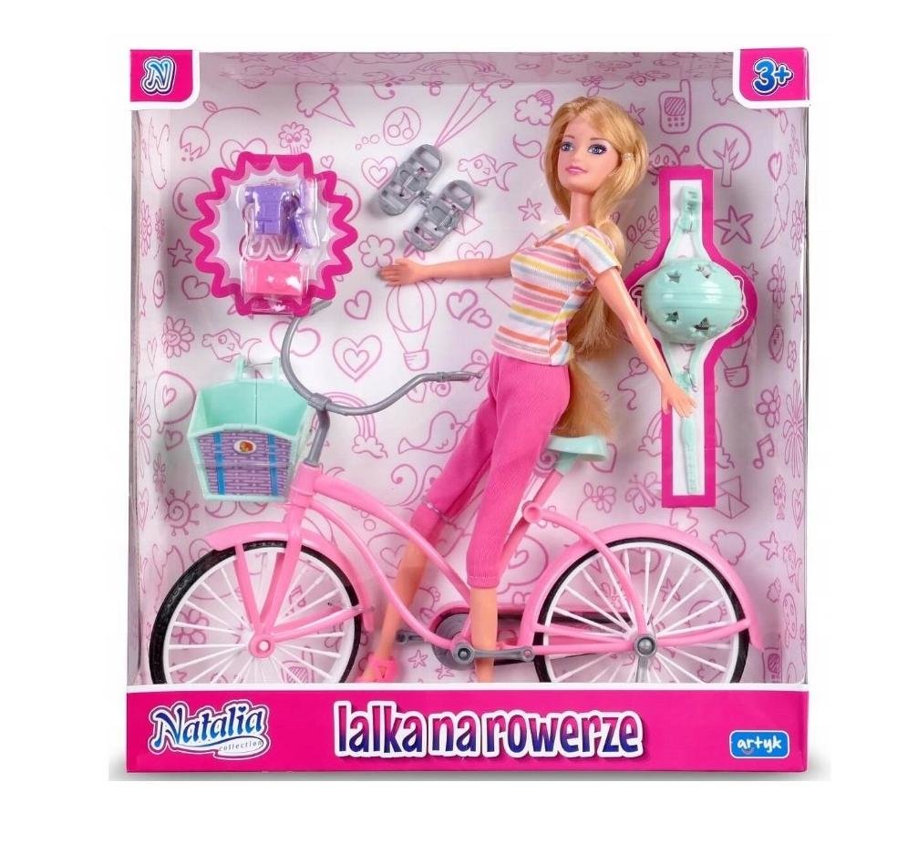 Lalka Natalia 29 cm. W zestawie: lalka, rower, kask, koszyk na rower, akecesoria. 2 wzory. Wymiary opakowania: 29x31x7cm.Wiek: 3+ číst celé