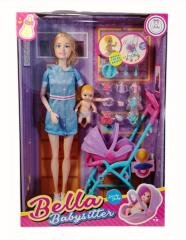 Zestaw opiekunki z lalką, małym bobasem, wózkiem dziecięcym i akcesoriami do zabawy i karmienia. Zapakowany w kartonowe pudełko. Podane wymiary są wymiarami opakowania.