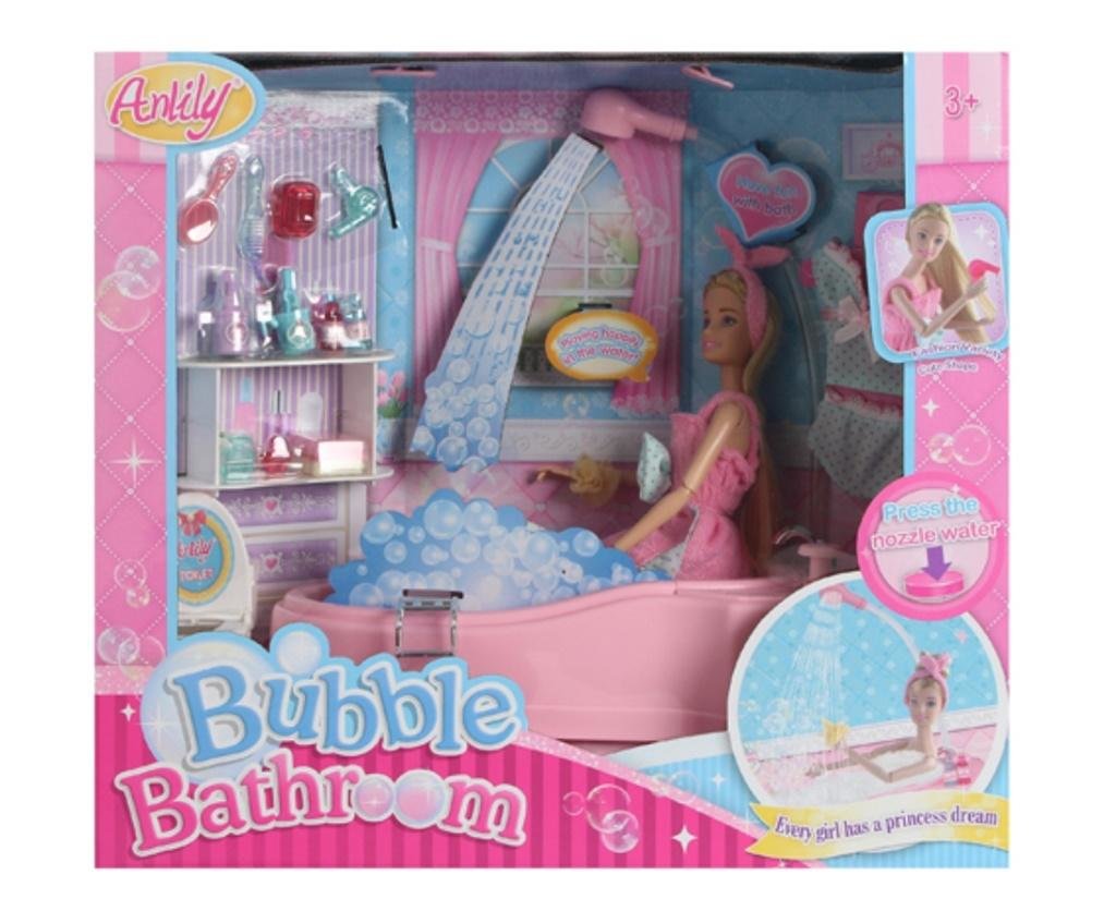 Lalki z akcesoriami to ulubione zabawki niemal każdej małej dziewczynki. Prezentowana na tej aukcji Anlily ma własną łazienkę z prawdziwą kąpielą wodną. Za pomocą przycisku można pompować wodę, aby leciała z prysznica. W tej łazience znajduje się wszystko, co tylko jest potrzebne: wieszak na ubrania,półki z kosmetykami oraz wanna z prysznicem.Baw się razem z Anlily!