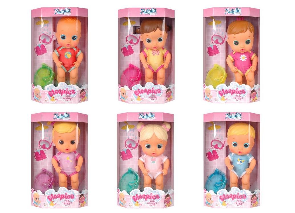 Lalka z płetwami i goglami do pływania. Funkcję: naciśnij lalkę na brzuszek i zanurz w wodzie z płynem. Wyjmij i pnownie naciśnij na brzuszek, a lalka wypluje wodę buzią i będzie robić bańki. Po założeniu maski będzie pluć wodą przez rurkę. Po zamoczeniu na kostiumie pojawi się ukryty deseń. 6...