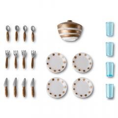 Dzięki eleganckiej zastawie obiadowej zabawa w domku dla lalek nigdy się nie kończy. Zestaw zawiera szklanki, talerze, łyżki, widelce i noże dla czterech osób. Nakrycie stołu uświetnia naczynie do serwowania z pokrywką.