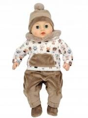Głowa, dłonie oraz nogi do ud wykonane są z winylu, korpus miękki wykonany z materiału. Ubranko można zdjęć i prać.