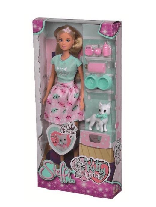 Steffi opiekuje się kotkiem, jej strój jest dopasowany do charakteru pupila. Kociak ma brudny pyszczek, można go wyczyścić pocierając namoczoną w ciepłej wodzie dołączoną ściereczką - reaguje na zmianę temperatury, dołączone akcesoria do pielęgnacji i zabawy.