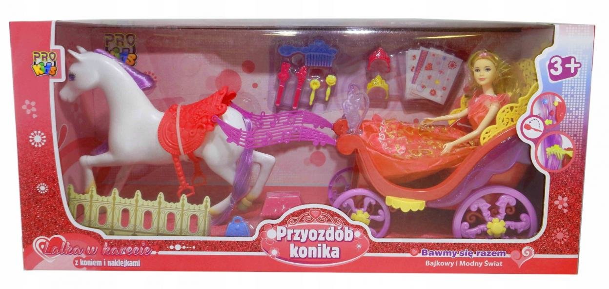 Lalka z koniem i karetą na baterie. Jeździ i wydaje dźwięki. Konik do dekorowania zestaw z naklejkami, wiele dodatków dla lalki oraz konika. Konika można nie tylko przyozdabiać naklejkami dołączony do zestawu ale i udekorować jego włosy.Światło, Dźwięk, w zestawie laleczka, konik, dodatki oraz...