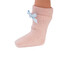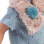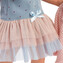 Ta śliczna panienka ma na sobie błękitną sukienkę z tiulową spódnicą, pudrowe skarpetki z kokardkami, opaskę, futrzany szalik oraz różową kurtkę.