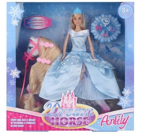 Lalka Anlily księżniczka 30 cm z koniem. Dodatkowe akcesoria: naszyjnik, 3 pary kolczyków. Produkt nie potrzebuje baterii. Zabawka przeznaczona dla dzieci powyżej 3 roku życia.