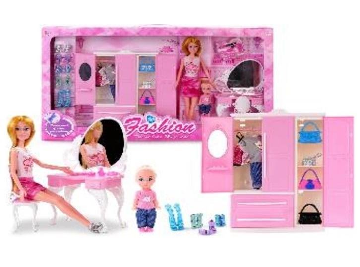 W zestawie: lalka 29 cm., laleczka 8 cm., toaletka z lustrem i krzesełkiem, szafa, 4 torebki, 5 par butów, 3 ubranka, akcesoria fryzjerskie