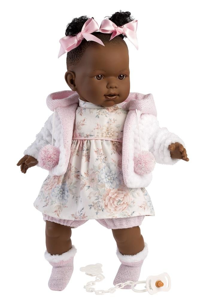 Lalka płacząca Nicole mierzy 42 cm. Jej rączki, nóżki oraz głowa są wykonane z miękkiego w dotyku winylu, zaś brzuszek jest materiałowy. Lalka płaczę i woła mama, papa po wyjęciu smoczka.