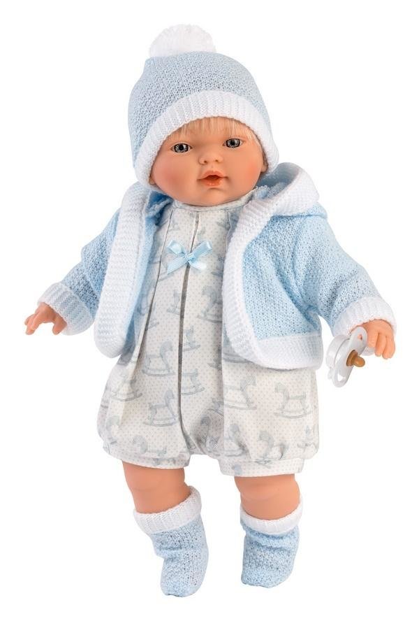 Mluvící panenka s měkkým látkovým tělem a s vlásky po celé hlavě. Po vytažení dudlíku z úst začne panenka říkat „mama“, „papa“ a vydávat reálný zvuk plačícího miminka. Panenku lze utišit dudlíkem. Velikost 33 cm. Součástí balení je 3 x knoflíková baterie LR44. ***** Součástí ceny je recyklační příspěvek ve výši 1 Kč bez DPH.