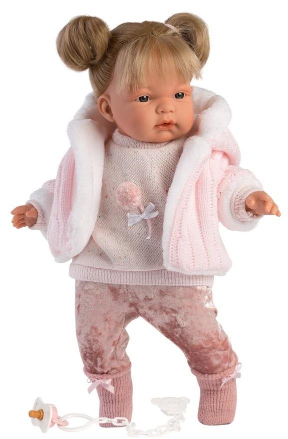 Mluvící panenka s měkkým látkovým tělem a s vlásky po celé hlavě. Po vytažení dudlíku z úst začne panenka říkat „mama“, „papa“ a vydávat reálný zvuk plačícího miminka. Panenku lze utišit dudlíkem. Velikost 38 cm. Součástí balení je 3 x knoflíková baterie LR44. ***** Součástí ceny je recyklační příspěvek ve výši 2,50 Kč bez DPH.