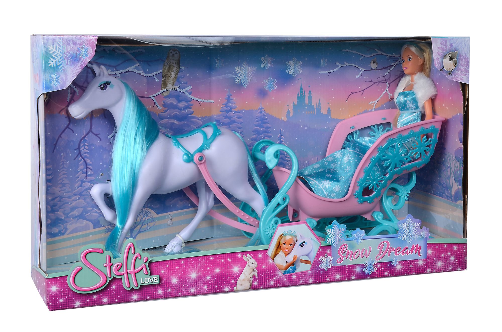 Panenka Steffi jako ledová princezna, s koněm a kouzelnými zimními saněmi. Délka 60 cm. Velikost panenky 29 cm.