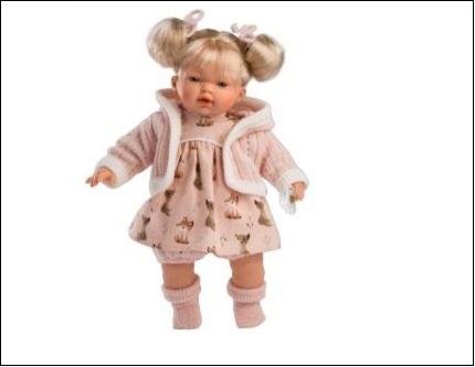 Lalka płacząca Roberta 33 cm została ubrana w różową sukieneczkę w liski, różową bluzę z kapturem, bloomersy oraz skarpetki.