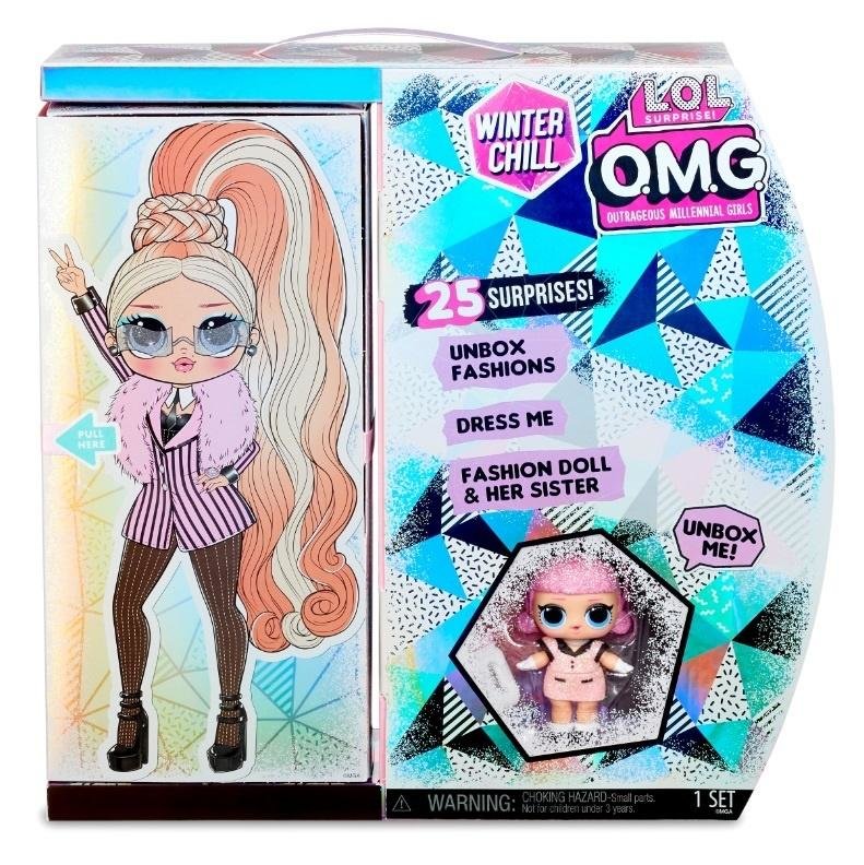Lalka L.O.L Surprise O.M.G Winter Wonderland. Opakowanie zawiera jedna modną lalkę oraz dodatkową mniejszą laleczkę - młodszą siostrę. W skład zestawu wchodzi 25 niespodzianek, m.in. strój, buty i inne akcesoria. Produkt przeznacozny od 3. roku życia.