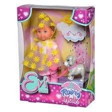 Evi w płaszczu przeciwdeszczowym z kapturem i w kaloszach. Wyprowadza swojego pieska na spacer.