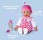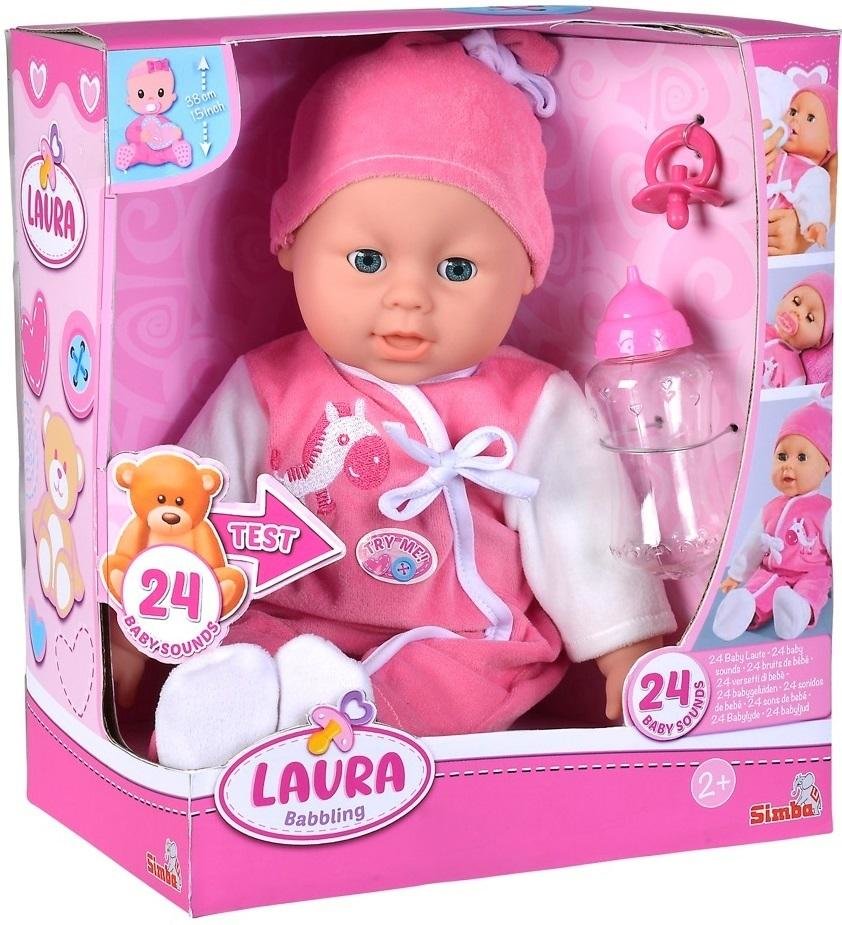 Gaworząca lala Laura ma ok. 38 cm wysokości. Lalka z miękkim ciałem, ze śpiącymi oczami, ubrana jest w słodki kombinezon. Wydaje 24 dziecięce dźwięki.