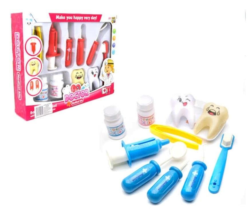 Zestaw Dentysta składa się z zębów, smutnego i wesołego, szczoteczki, narzędzi dentystycznych oraz fiolek leków. Zestaw zawiera 11 elementów.