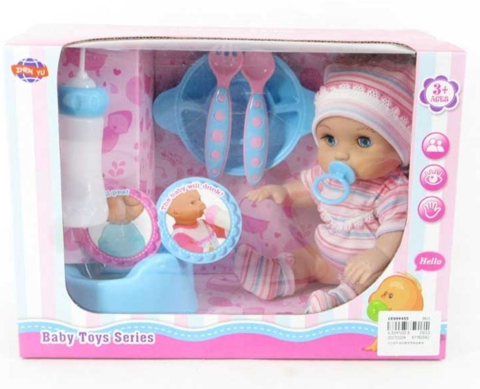 Lalka 25 cm sikająca z akcesoriami: nocnik, talerz, widelec, łyżka i butelka. číst celé
