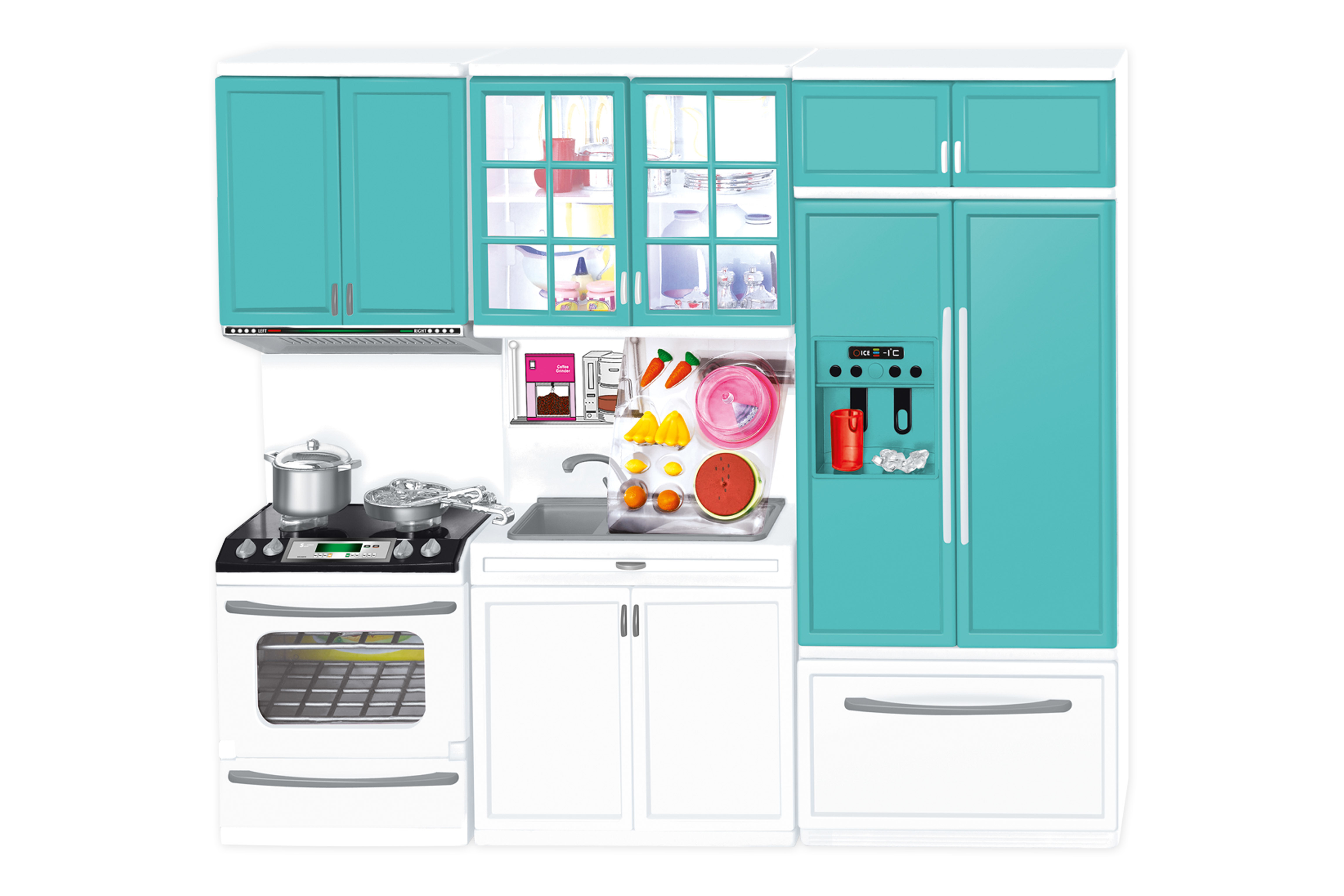 Kuchyňka. Rozměry 38x8x32cm. Obsahuje vařič s troubou, chladničku a dřez. Vařič a trouba vydává světelné a zvukové efekty. Efekty se zapínají spínačem na vařiči. 2xAAA baterie součástí. číst celé