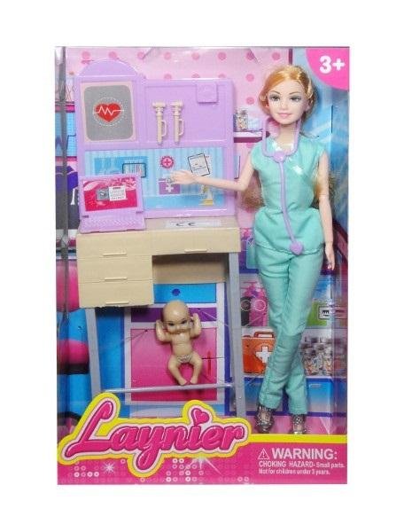 Lalka doktor wraz niemowlakiem oraz akcesoriami służącymi do profesjonalnego badania. W zestawie m.in.: biurko, laptop, stetoskop, młotek lekarski. Produkt zapakowany w kartonowe opakowanie z przezroczystym okienkiem. Podane wymiary są wymiarami opakowania.