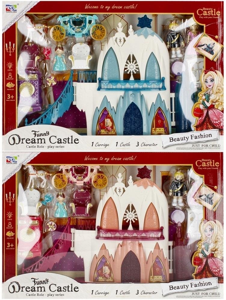 Zalety produktu: rozwija kreatywność dziecka, zamek posiada otwierane drzwi, posiada efekty świetlne, występuje w dwóch wersjach kolorystycznych. Zamek księżniczki będzie idealnym wypełniaczem czasu podczas zabawy dla każdej małej dziewczynki, marzącej by zostać księżniczką! Zawartość zestawu: zamek, 3x figurka, karoca +koń, mebelki do salonu. Całość wykonana z plastiku. Wymiary/waga/baterie: wymiary produktu (dł. x wys. x gł.)[cm]: zamek 45x30x12, wymiary opakowania (dł. x wys. x gł.) [cm]: 51x35x8, waga produktu bez opakowania [kg]: 0,07 kg, waga produktu w opakowaniu [kg]: 0,80 kg, Wymaga zasilania bateriami- 3x AG13/LR44-załączone do zestawu. Zabawka przeznaczona dla dzieci w wieku: 3+. Pakowana w kartonik z okienkiem.