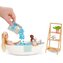 Tento herní set Barbie® Panenka a koupel s mýdlovými konfetami s vanou a panenkou Barbie® obsahuje Barbie® panenku oblečenou do plavek s roztomilým sarongem, která je polohovatelná a dodává se se spoustou doplňků, jako jsou vana a podnos, ručník, kartáče, štěňátko a další. Součástí balení jsou dva sáčky konfetového mýdla (růžové a modré), které změní barvu vody ve vaně! Panenka neumí samostatně stát.