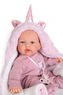 Niewielka dziewczynka została ubrana we wrzosowe śpioszki na długi rękaw z przyszytą na środku ubranka aplikacją jednorożca. W dodatkach do drobnej Petit nie mogło przecież zabraknąć okrycia, dlatego też producent wyposażył komplet w przytulny kocyk z kapturem jednorożca. Środek koca tworzy biały polar, z kolei strona zewnętrzna została wykonana z przyjemnego w dotyku materiału i ozdobiona kolorową mieniącą się nitką. Dopełnieniem zestawu będzie smoczek zawieszony na tasiemce, dzięki temu nasza pociecha będzie miała go zawsze przy sobie. Smok sprawi, że odgrywane z lalą scenki staną się bardziej realne, a nasze najmłodsze pociechy będą miały możliwość nauki odpowiedzialności oraz troski o drugiego człowieka.