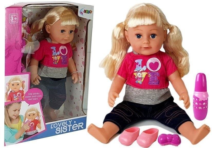 Duża Lalka Pije Płacze Prawdziwymi Łzy z Akcesoriami do Włosów Każda mała dziewczynka marzy o lalkach, nawet kolekcjonuje rożne rodzaje. Przedstawiamy wyjątkową lalkę, która pije wodę i płaczę prawdziwymi łzami! Super zabawa a do tego nauczy twoje dziecko odpowiedzialności i opieki nad innymi dziećmi. Lalka ma piękne, długie blond włosy, z których można pleść warkocze. Potrafi usiąść, samodzielnie stoi, ma opcję zginania kolan. Dodatkowo w zestawie dołączone są 3 spinki i 3 gumki do włosów oraz szczotka teraz twoja mała dziewczynka może zostać fryzjerką. Może w przyszłości będzie to jej zawód? Elementy zestawu: - lalka - szczotka - butelka - gumki i spinki do włosów - buciki Długość lalki: 45 cm Wymiary pudełka: 33 cm x 47 cm x 15 cm Zabawka zasilana jest trzema bateriami 1,5 V AAA ( nie ma w zestawie). Lalka przeznaczona jest dla dzieci powyżej 3. roku życia. Zabawka posiada certyfikat CE i jest zgodna z normą EN 71. Bobas zapakowany jest w kolorowe pudełko z przezroczystą witrynką, dzięki czemu nadają się na prezent dla dziecka.
