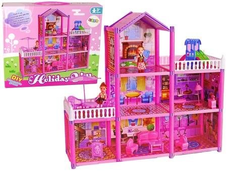 Domek Dla Lalek DIY Willa Lalka Wyposażenie 129 Elementów Różowa W pełni wyposażony domek dla lalki to propozycja, którą każda młoda dama musi mieć w swoim pokoju. Zabawa w rodzinę oraz lalkami jest jednym z ulubionych zajęć małych dziewczynek. Zabawka pozwala na stworzenie własnego, niepowtarzalnego domu. Konstrukcja jest bardzo przemyślana i sprytna. Domek może stanowić piękną ozdobę pokoju małej księżniczki. Cała willa ma 3 niezależne poziomy, w których znajduje się łącznie 5 pomieszczeń i dwa zewnętrzne tarasy. Na parterze znajdziemy przepiękne pokoje gościnne. Kolejne piętro zajmuje pokój dzienny i przepiękny taras, gdzie można się zrelaksować. Na ostatnim piętrze z pomieszczenia wychodzisz na balkon, gdzie możesz urządzić mały plac zabaw ze zjeżdżalnią. Szereg dodatków do wystroju i meble umożliwi stworzenie własnej willi według gustu. Wewnątrz znajduje się 129 sztuk, do złożenia willi oraz urządzenia jej wnętrza. Wszystko zachowane zostało w pięknej różowej kolorystyce, która spodoba się każdej małej fance zabaw lalkami. Czas poćwiczyć zdolności manualne i rozpocząć zabawę. Elementy zestawu: - elementy do złożenia willi - mebelki: sofa, dwa fotele, szafka, lampa - mała lalka x2 - wanna - meble ogrodowe: parasol, stolik, trzy krzesła Wymiary domku: 60 cm x 57 cm x 18 cm Wymiary lalki: 11 cm długość Wymiary pudełka: 28 cm x 33 cm x 8 cm Domek przeznaczony jest dla dzieci, które ukończyły 3. rok życia. Prezentowany zestaw jest wykonany z najwyżej jakości tworzywa sztucznego.