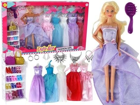 Lalka Dla Dzieci Długie Blond Włosy Szafa Buty Sukienki Akcesoria Oto uroczy zestaw lalki, który z pewnością oczaruje małe serca. Lalka ma wysokość 30 cm i zachwyca długimi, łatwymi do czesania blond włosami oraz niebieskimi oczami. W pięknej, błyszczącej sukni w odcieniach fioletu z tiulowymi elementami wygląda jak prawdziwa księżniczka. To nie wszystko! Zestaw zawiera także elegancką białą szafę z 12 parami butów na zmianę na obcasie. Lalka ma do dyspozycji aż 5 różnych sukienek wieczorowych, w tym białą, fioletową, ciemnoróżową, niebieską i jasnoróżową, z tiulowymi dodatkami i brokatowymi zdobieniami. Dodatkowo, zestaw jest bogaty w akcesoria, takie jak 2 pary srebrnych kolczyków, 2 torebki (fioletowa i złota), 3 naszyjniki, spinka do włosów i szczotka do włosów. Wszystko to zapakowane jest w piękne opakowanie o wymiarach 53,5 cm x 32 cm x 6 cm, co sprawia, że jest idealnym prezentem dla małych miłośniczek mody i kreatywnej zabawy. Dzięki temu zestawowi dzieci mogą rozwijać swoją wyobraźnię, tworzyć różne stylizacje i bawić się godzinami, kreując różnorodne historie dla swojej lalki. Elementy zestawu: - lalka - 12 par butów w szafie - 5 sukienek - 2 pary kolczyków - 3 naszyjniki - szczotka do włosów - 2 torebki - spinka do włosów Wymiary opakowania: 53,5 cm x 32 cm x 6 cm Posiada certyfikat CE, ponadto jest zgodny z normą EN71. Zabawka przeznaczona jest dla dzieci powyżej 3 roku życia.