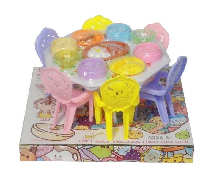 Plastikowe mebelki dla lalek w pastelowych kolorach z zestawem gotowym do zorganizowania uroczystej kolacji.#&Produkt w opakowaniu z kartonową podstawką z przezroczystym kloszem.#&Podane wymiary są wymiarami zabawki w opakowaniu. #&Produkt dla dzieci od 3 lat.