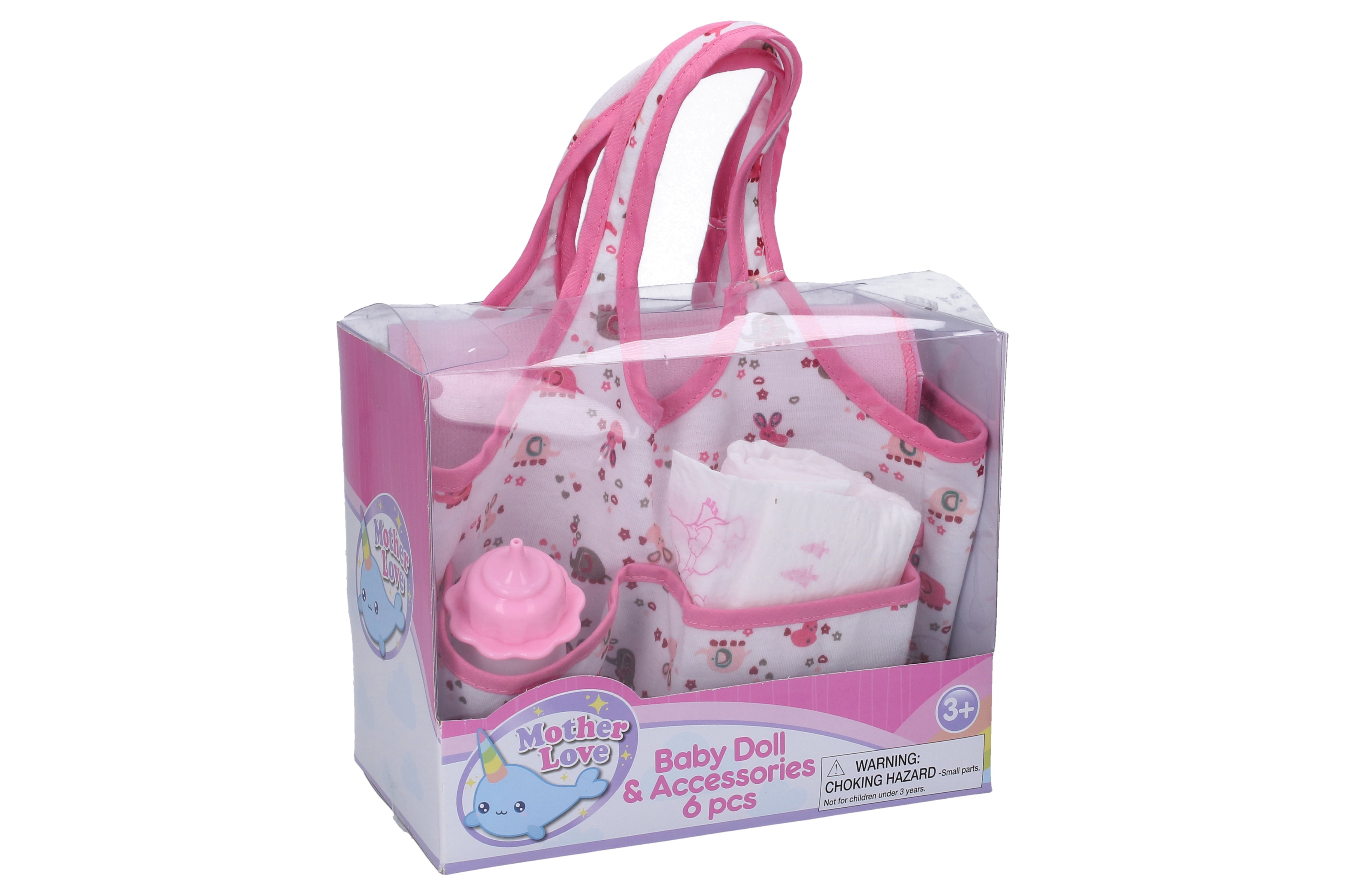 Doplňky pro panenku. Balení obsahuje taštičku na příslušenství, plenku, lahvičku, látkovou plenku a podložku na přebalení. číst celé