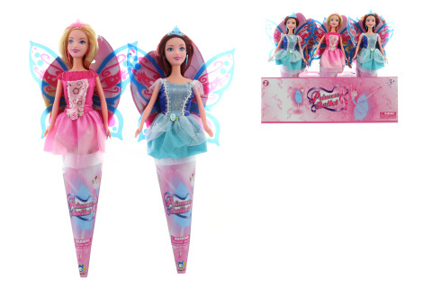 Krásná panenka v kornoutu s motýlými křídly. Panenka je kloubová, má pohyblivé ruce, nohy a hlavu a je ozdobena korunkou a naušnicemi. Materiál plast, kornout papírový. Rozměry panenky s křídly cca 32x16 cm. Věk 3+