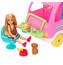 Tento multifunkční růžový kamper lze snadno proměnit v plně vybavené obozoviště s kuchyní, pohodlnou střechou sloužící jako ložnice a osvěžujícím bazénem. Vaše děťátko může otevřít automobil, natočit palubní desku pro vytvoření jídelního prostoru, sundat střechu a odhalit pohodlné lůžko pro panenku Chelsea. K tomu přidejte přírodu ve formě stromku a hamaku, kde si může děvčátko představovat, jak se Chelsea i její mazlíčci uvolňují a užívají krásné slunečné dny.