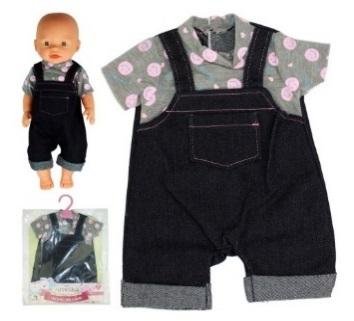 Urocze Spodenki dżinsowe na szelkach z wszytą bluzeczką dla lalki. Ślicznie ozdobione kieszonką, z tyłu zapinane na rzep. Wieszaczek w komplecie.