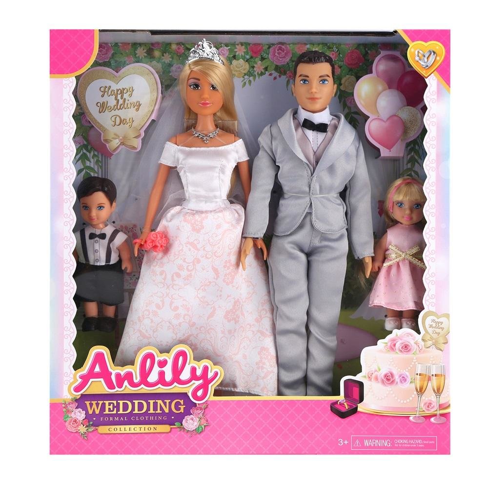Zestaw 4 lalek: zestaw ślubny - panna młoda (29 cm), pan młody (29 cm), dziewczynka, chłopiec Wymiary opakowania: 30.2 x 5 x 32.2 cm