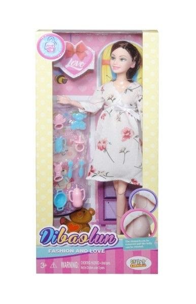 Lalka (typu Barbie) w ciąży. Brzuszek lalki można chować. W zestawie także akcesoria niemowlaka jak: gryzaczki, smoczek, butelka, miseczka. Produkt zapakowany w kartonowe opakowanie z przezroczystym okienkiem. Podane wymiary są wymiarami opakowania. Lalka przeznaczona dla dzieci od 3 lat.