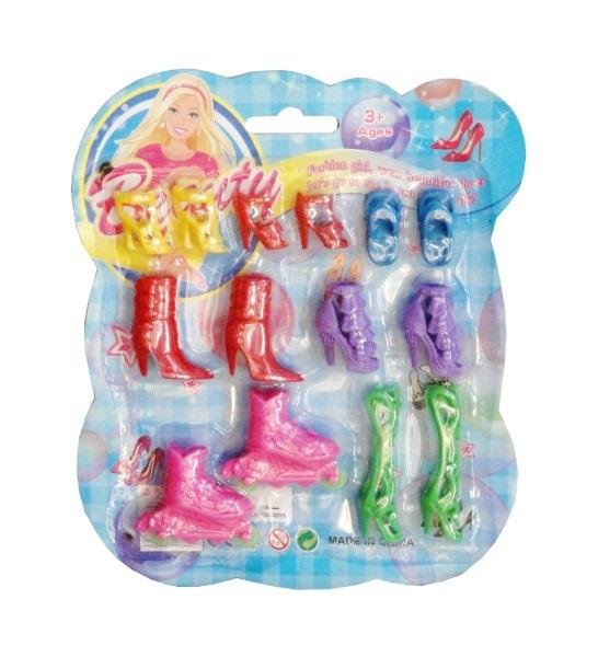 Zestaw kolorowych, różnych bucików lalki typu Barbie. Produkt zapakowany w kartonową podstawkę z przezroczystym kloszem. Produkt przeznaczony dla dzieci od 3 lat.