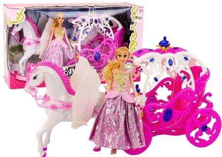 Lalka Z Karocą Koniem Kareta Księżniczka Różowa Pegaz Zestaw Zestaw lalka księżniczka z karocą i pegazem to niezwykle urokliwy komplet, który przenosi dzieci w magiczny świat bajek i fantazji. Pegaz, będący centralnym elementem zestawu, ma elegancki biały kolor oraz duże, majestatyczne białe skrzydła, które sprawiają, że wygląda, jakby mógł w każdej chwili unieść się w powietrze. Jego różowa grzywa i uprząż dodają mu uroku i bajkowego charakteru, czyniąc go idealnym towarzyszem dla księżniczki. Karoca, w której księżniczka podróżuje, jest pięknie wykonana w kolorach różowym i białym z dodatkiem niebieskich elementów. Te harmonijnie dobrane barwy sprawiają, że cała karoca prezentuje się niezwykle stylowo i elegancko. Detale takie jak ozdobne wzory i delikatne wykończenia nadają jej królewskiego charakteru, a koła są solidne i stabilne, co zapewnia płynną jazdę. Lalka księżniczka, będąca sercem tego zestawu, ma długie, lśniące blond włosy, które można czesać i stylizować na różne sposoby. Jej strój to błyszcząca różowo-złota suknia, która mieni się w świetle, dodając jej blasku i splendoru. Całość dopełniają białe, eleganckie buciki, które są idealnym uzupełnieniem jej królewskiego wyglądu. Ten zestaw wygląda jak wyjęty z prawdziwej bajki i z pewnością zachwyci każde dziecko, które marzy o przygodach w magicznym królestwie. Dzięki detalom i wysokiej jakości wykonaniu, zabawka ta zapewni wiele godzin kreatywnej i radosnej zabawy. Wymiary konia: 29 cm x 27 cm x 8 cm Wymiary karocy: 33 cm x 14 cm x 32 cm Wymiary lalki: 31 cm x 11 cm x 5 cm Wymiary opakowania: 58 cm x 34 cm x 19 cm Posiada certyfikat CE, ponadto jest zgodny z normą EN71. Przeznaczony dla dzieci powyżej 3 roku życia.