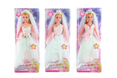 Panenka o velikosti cca 28 cm kloubová. Panenka je oblečená do svatebních šatů, součástí jsou troje náušnice, závoj a lodičky. Rozměry balení cca 33 x 14 x 6,5 cm. Věk 3+