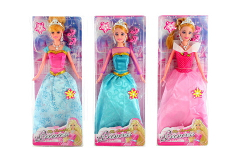Panenka o velikosti cca 28 cm kloubová. Panenka je oblečená do dlouhých šatů, součástí je korunka, náušnice a lodičky. Rozměry balení cca 33 x 13 x 6,5 cm. Věk 3+