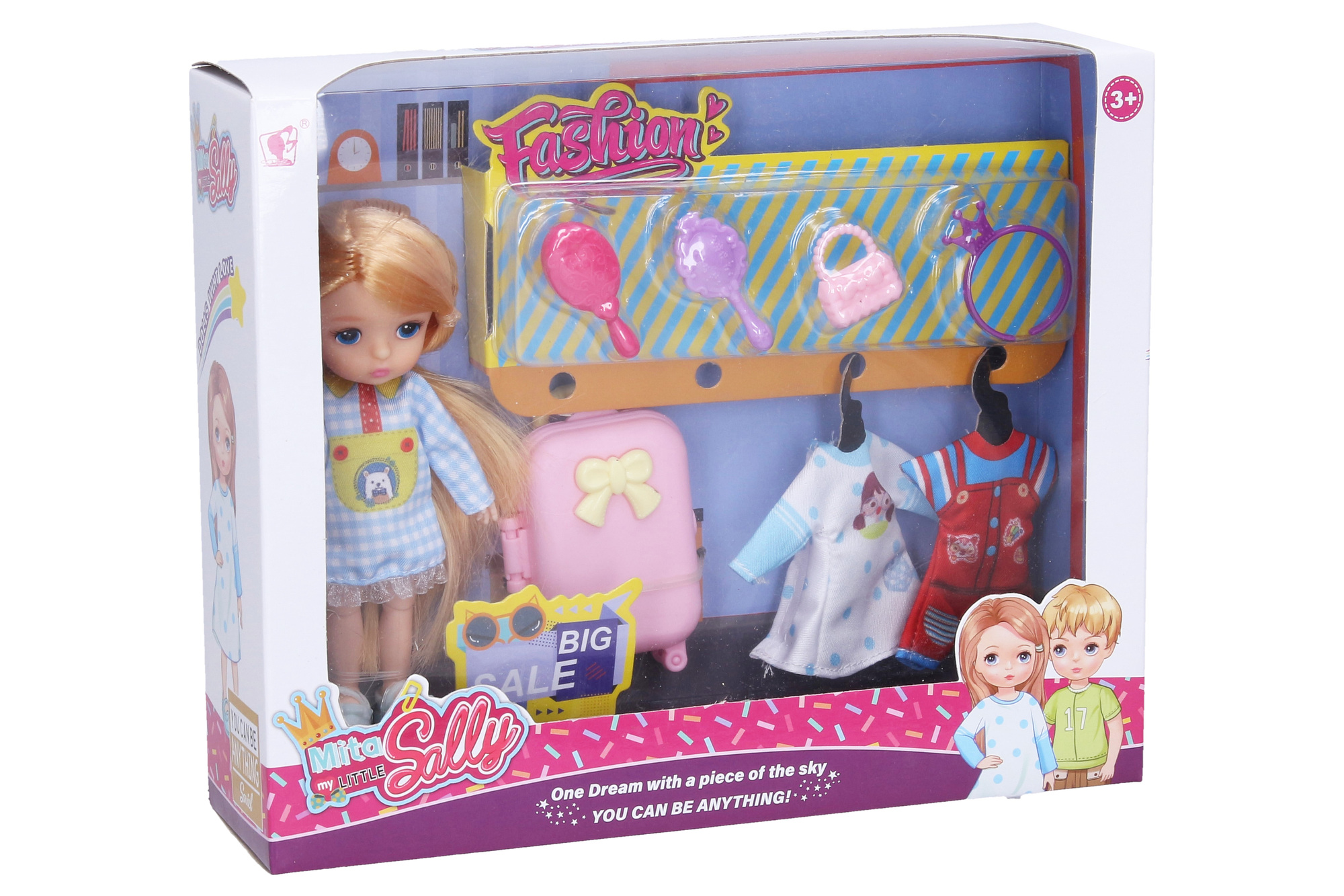 Panenka cestovatelka. Velikost panenky 13cm. obsahuje: panenku, cestovní kufr, 2oblečky, 2hřebeny, kabelku, korunku číst celé