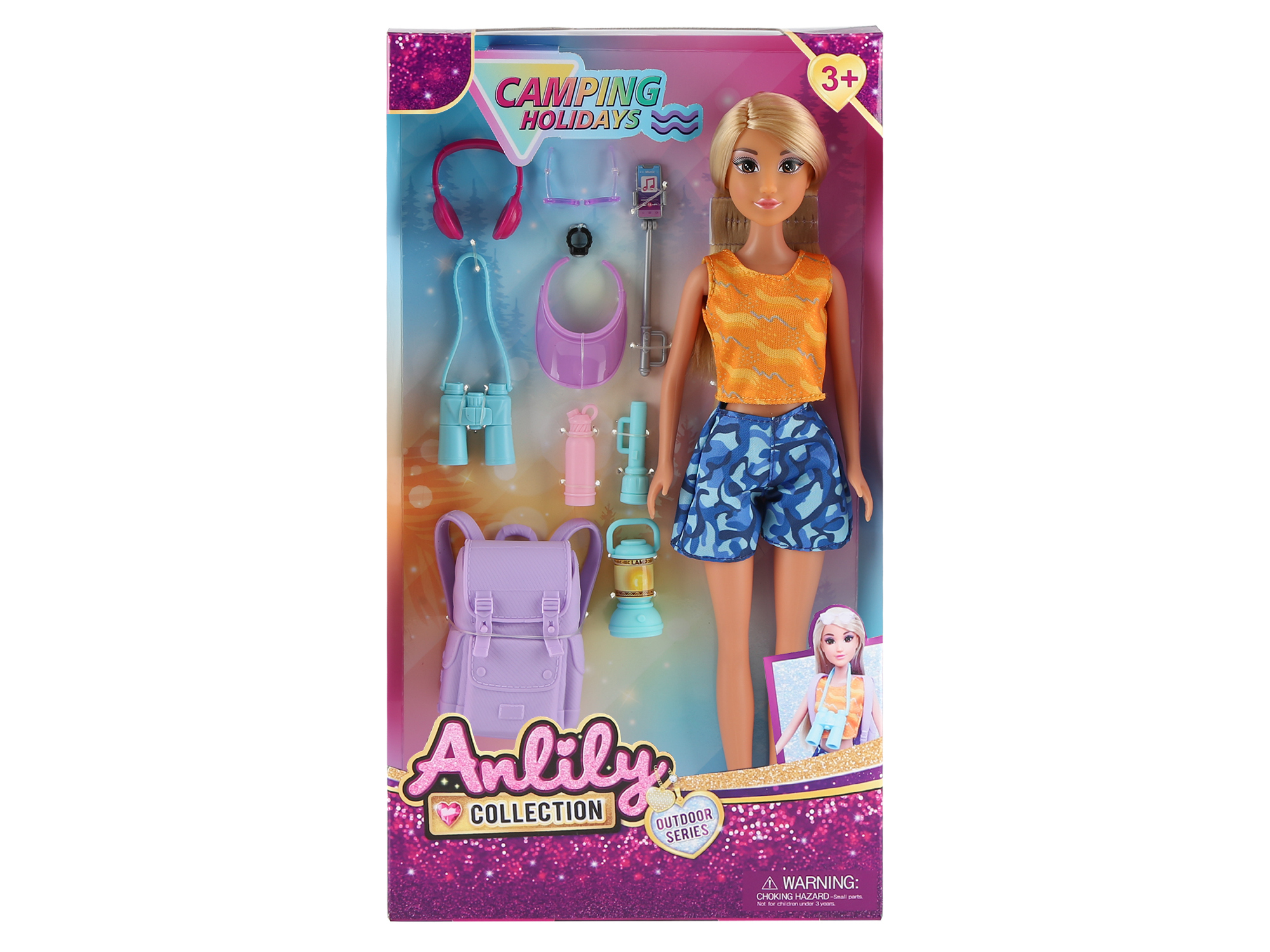 Panenka na výletě s doplňky. Velikost 30 cm. Doplňky - batoh, dalekohled, sluchátka, brýle, kšilt, láhev, svítilna, selfie tyč a další. číst celé
