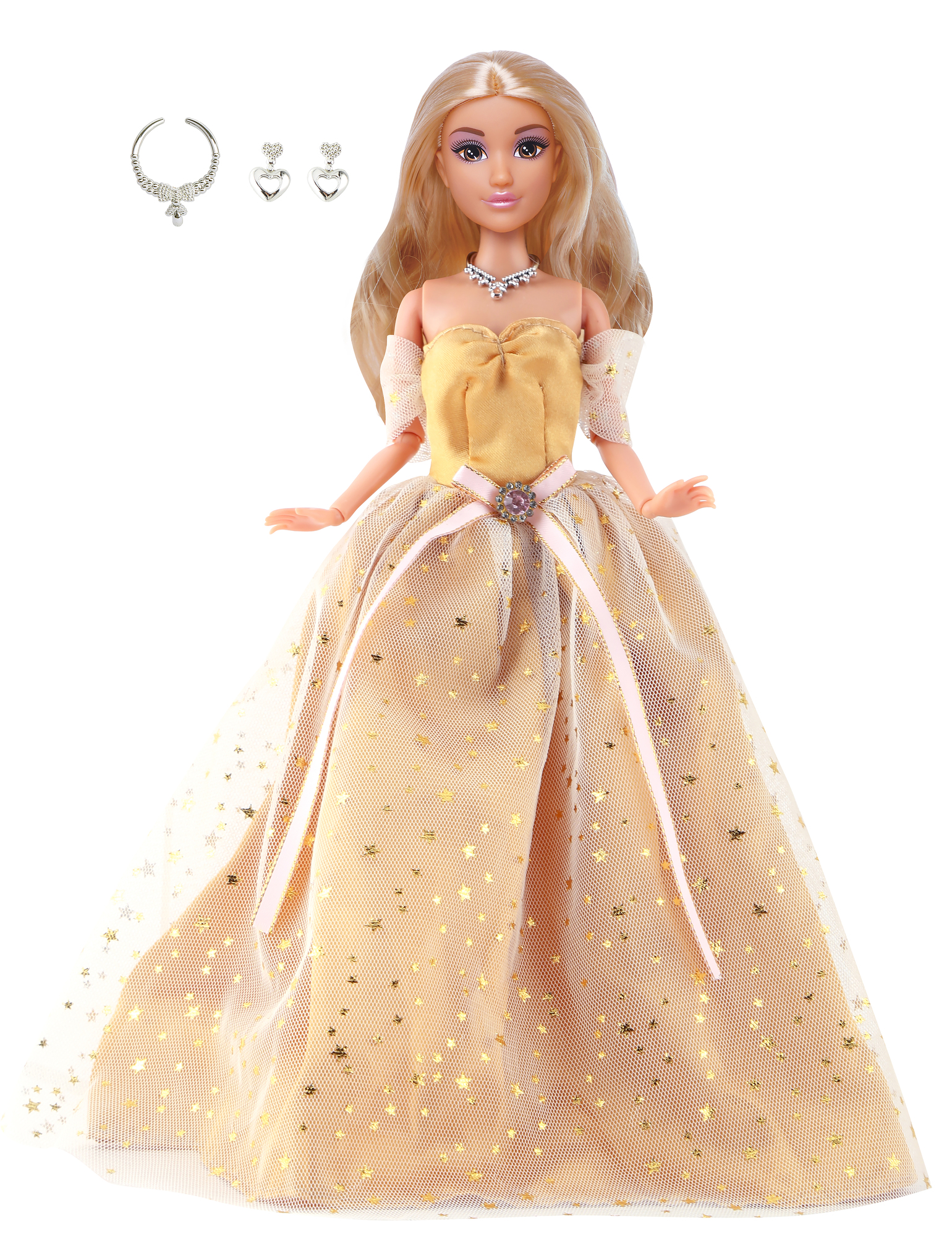 - Elegantní design: Krásné dlouhé zlaté šaty podtrhují jedinečný vzhled panenky.